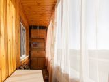 Балкон обшит деревом, пластиковые окна.